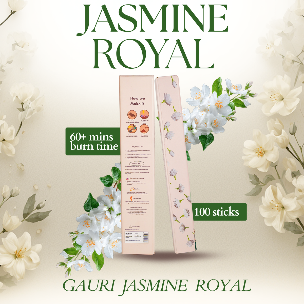 - INCENSE FOR MEDITATION: GAURI JASMINE Incense Sticks are handcrafted with Ayurvedic techniques to enhance the experience of your meditation practice. JASMINE is one of the most celebrated fragrances for spiritual practices. The package contains a set of 2 incense boxes with each box containing 50 incense sticks . Each sticks is 9 inch in length and offers a long burning time of 60-70 minutes.